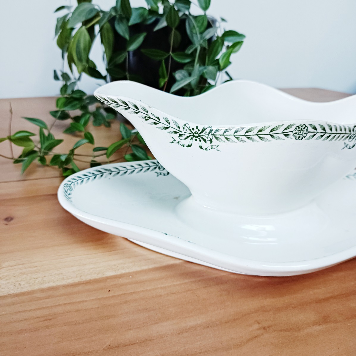 Charmante saucière ancienne en faïence terre de fer signée de la Société Amandinoise de Saint-Amand, modèle Victoire, au décor vert de feuillage et de nœud. Une pièce pleine de caractère, idéale pour sublimer une table vintage ou compléter une collection. Bon état avec traces du temps assumées.