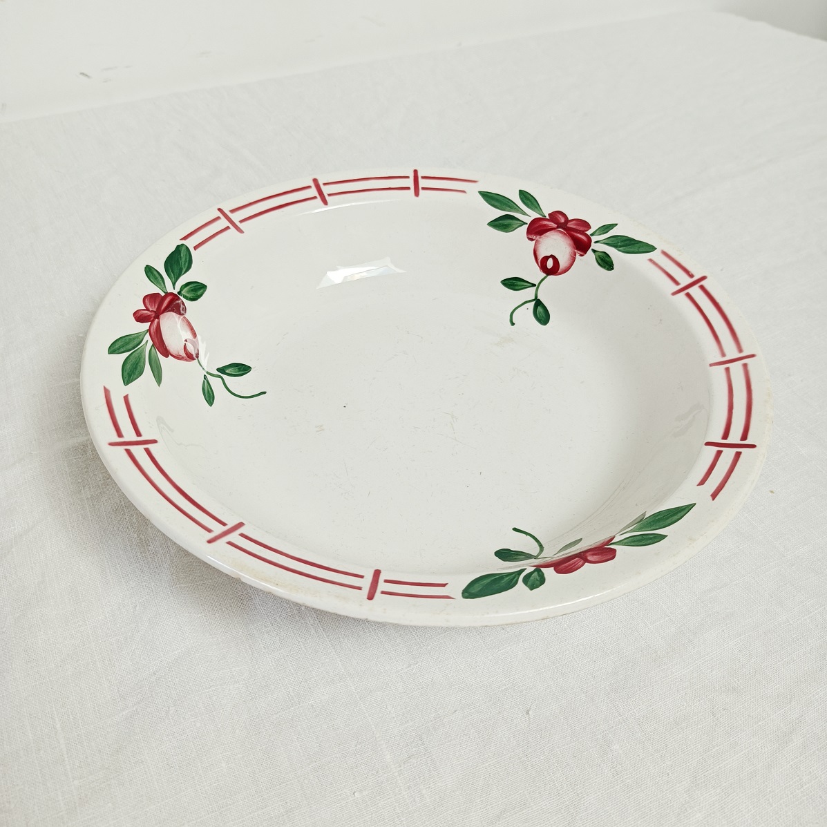 Plat creux ancien Digoin Sarreguemines, modèle Castille, à décor fleuri et frise rose bordeaux.