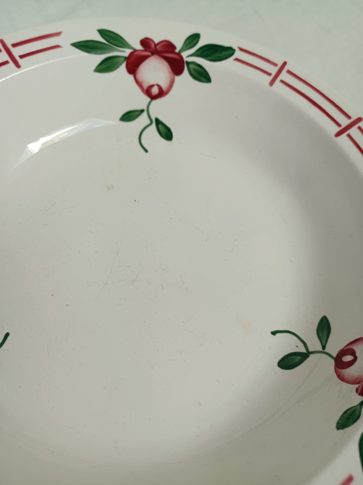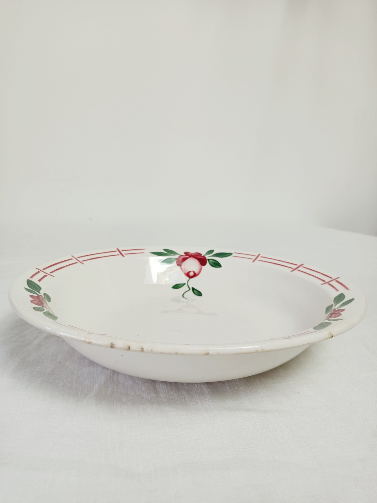 Ce plat creux Digoin Sarreguemines, issu du modèle Castille, est une vraie invitation aux tables chaleureuses d’autrefois. Son décor fleuri délicat, encadré d’une frise rose bordeaux, apporte une touche élégante et romantique à la faïence blanche. Une valeur sûre pour les amateurs de vaisselle ancienne qui aiment les pièces à la fois belles et utiles.