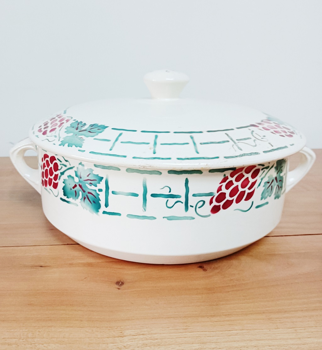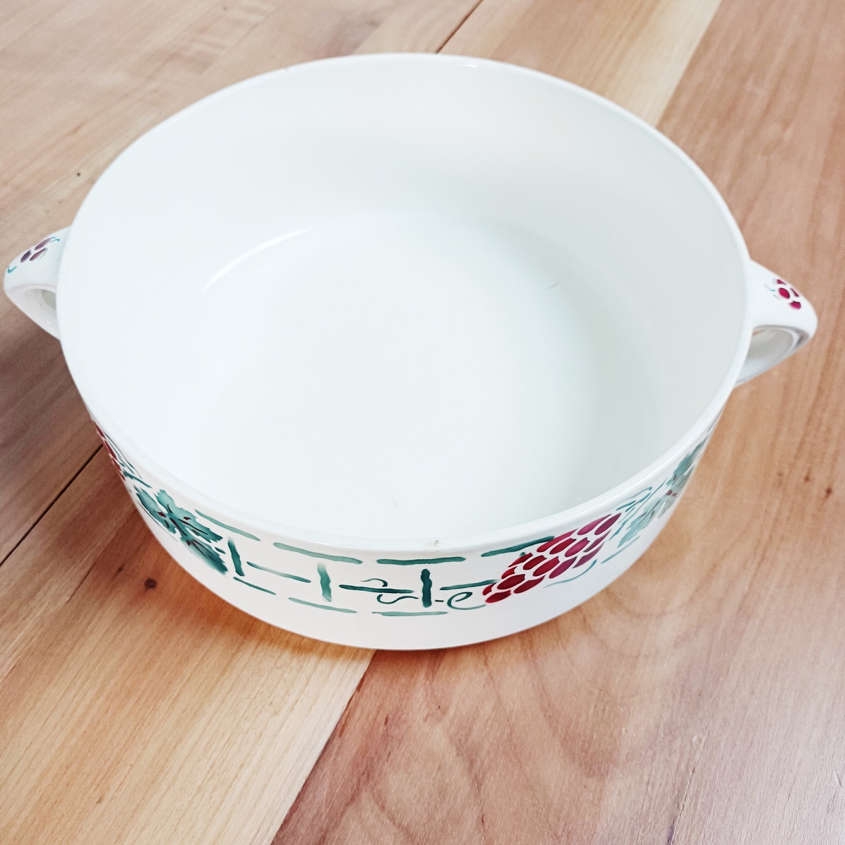 Cette soupière – légumier Badonviller, modèle Meudon, est une pièce généreuse et élégante, typique de la belle faïence française du début du XXe siècle. Son décor de grappes de raisin bordeaux, associé à une vigne verte et souligné par une frise en quadrillage, évoque immédiatement les grandes tablées conviviales et les repas qui s’éternisent (ceux où on se ressert “juste un peu”).