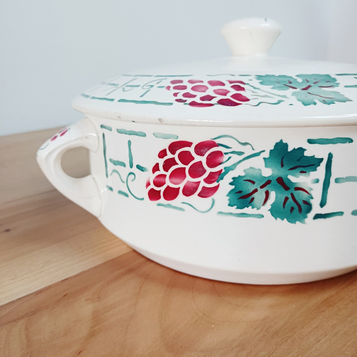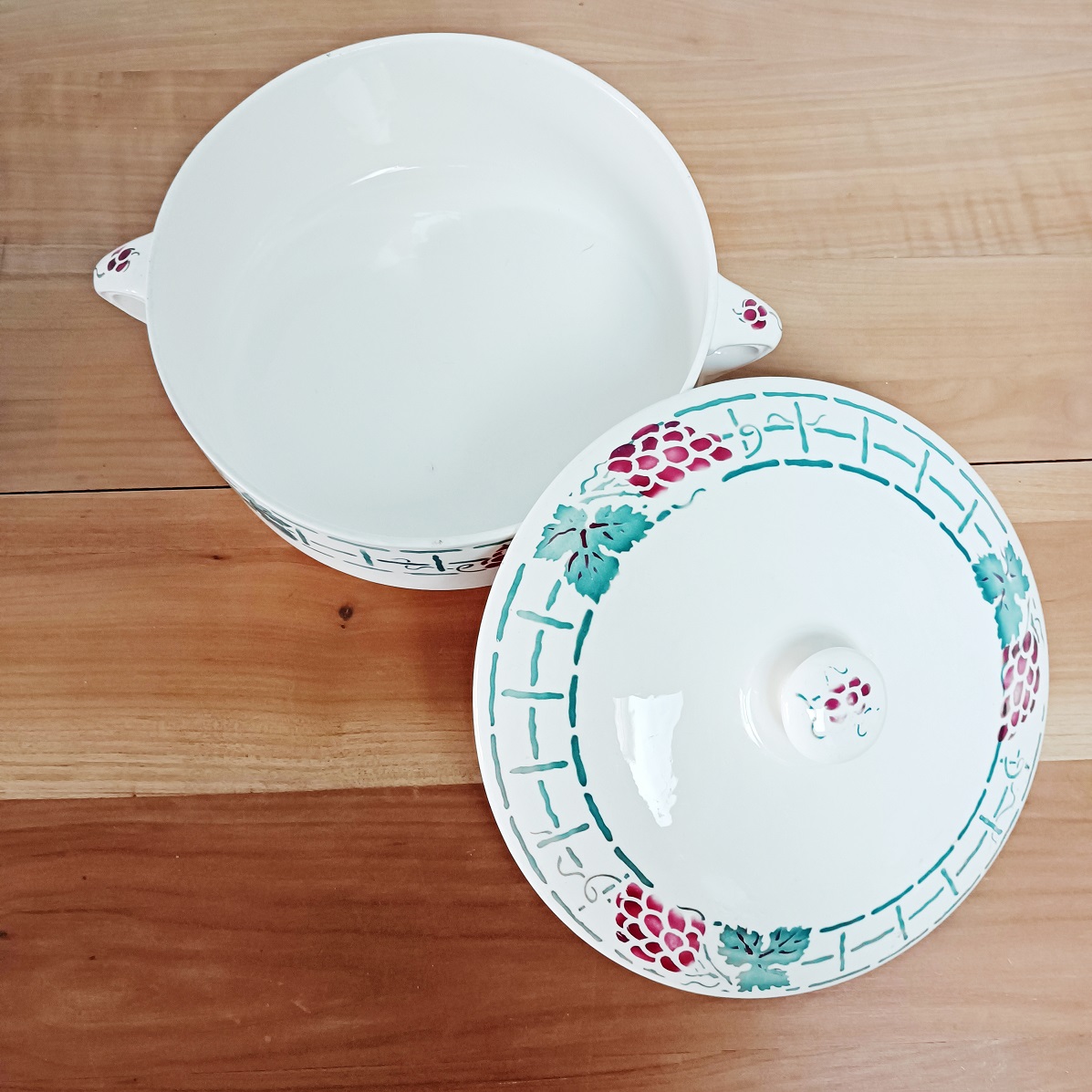 Soupière ou légumier ancien Badonviller, modèle Meudon, en faïence décorée de grappes de raisin bordeaux et vigne verte. Très bon état.